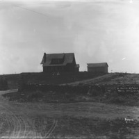 - "A House of Lava Rock, Near Gooding, Idaho;" a house and barn sit on a small rise; a lava rock wall with gate in foreground.
