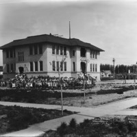 - "Public School. Gooding, Idaho;" a group of children pose in front of a three story brick school. Other houses and several wagons with horses can be seen in the background.