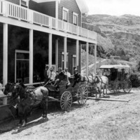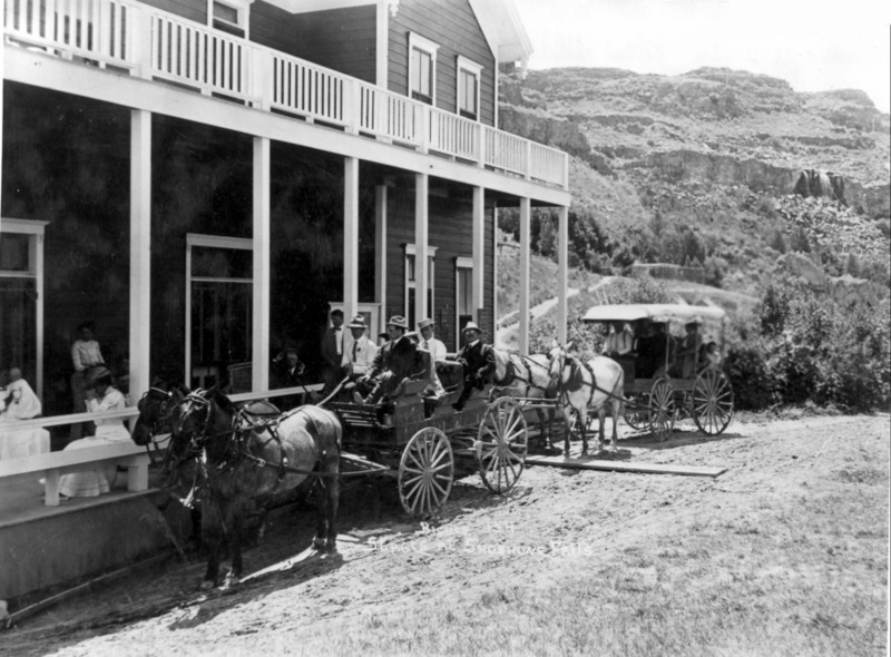 - "Stages at Shoshone Falls;" The Shoshone Falls Hotel (also known as Little Dewey House) with several people seated on the porch. A wagon and a covered buggy with horses and passengers are parked alongside the building.