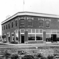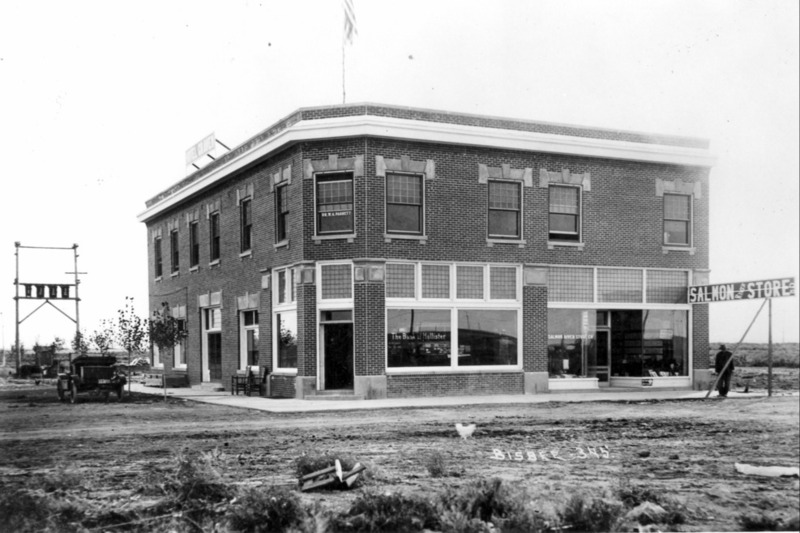 Two-story brick corner building that houses the Hotel Craven, Bank of Hollister, Dr. W. A. Parrett, and the Salmon River Store Co. A man stands beneath a wooden Salmon River Store, Co. sign at right and an auromobile is parked on left.