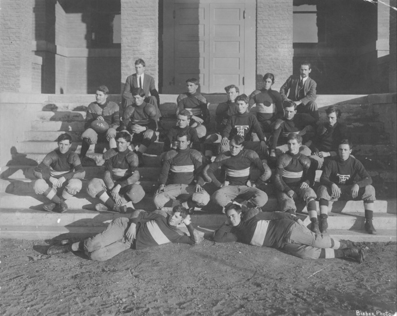 Twin Falls High School football team pose on the steps of Bickel School. Top row: B. H. (Bruce) McMillan, Manager; E. R. Dooley, coach (?). 2nd row: Dave Girdner; Rex Bailey; Jake (Jacob) Sinema; Orval Blades; Chas (Charles) Montgomery. 3rd row: Dana Elliott; Glenn Fitzpatrick; Curtis Bowers; Roy Weaver. 4th row: Cleve Costello; Sid McDonald; Harry Knight; Dan Adams; Rollo Crater; Chet Oakley. 5th row: Chas (Charles) Younger; Eugene Meigs