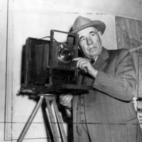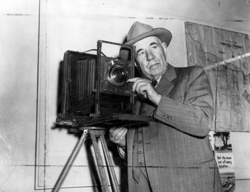 - Clarence E. Bisbee posing beside the camera that he used to take his early Twin Falls photos.