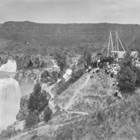 - Group of people posing near Ezra Meeker, his wagon and oxen on the right at the top of a rise by the Shoshone Falls on Flag Day, June 17th, 1910.