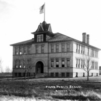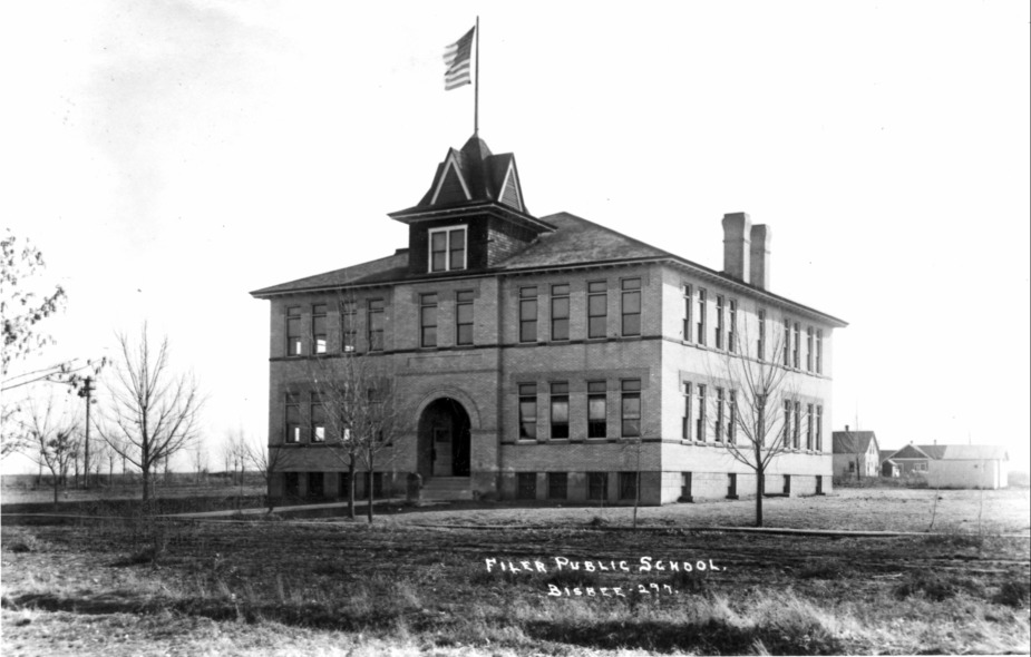 - "Filer Public School;" large brick school building; new trees planted along sidewalk; other structures in the background