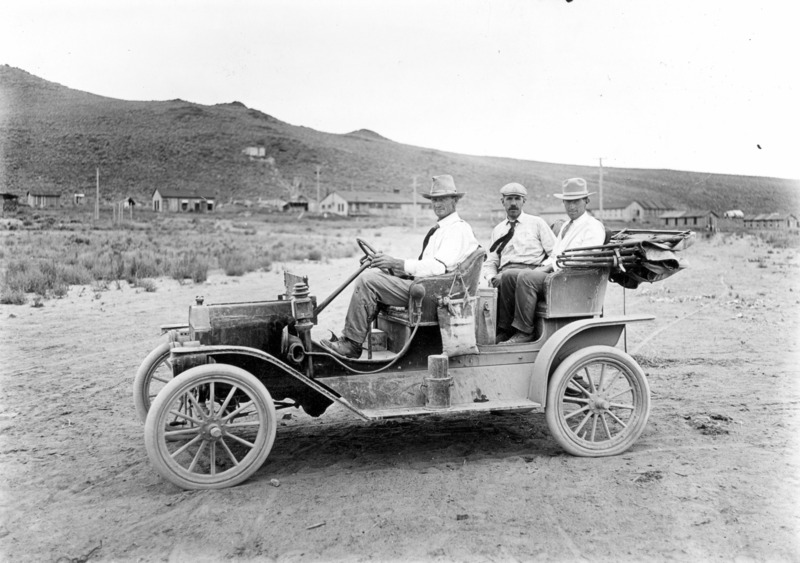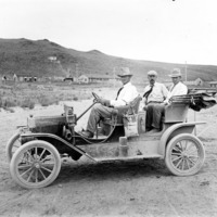 - Three men in an automobile at the Salmon Dam construction site. Center man is Clarence Bisbee; his photographic equipment is in the case at his feet.
