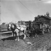 - A freight wagon pulled by four horses, stands along a muddy Twin Falls street. The first fire station, with the bell attached to the roof is directly behind the wagon. The Twin Falls Chronicle Newspaper building and other houses and buildings are also visible.