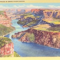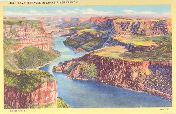 - "Lava Terraces in Snake River Canyon;" a hand-colored Bisbee photo postcard of a green canyon scene.