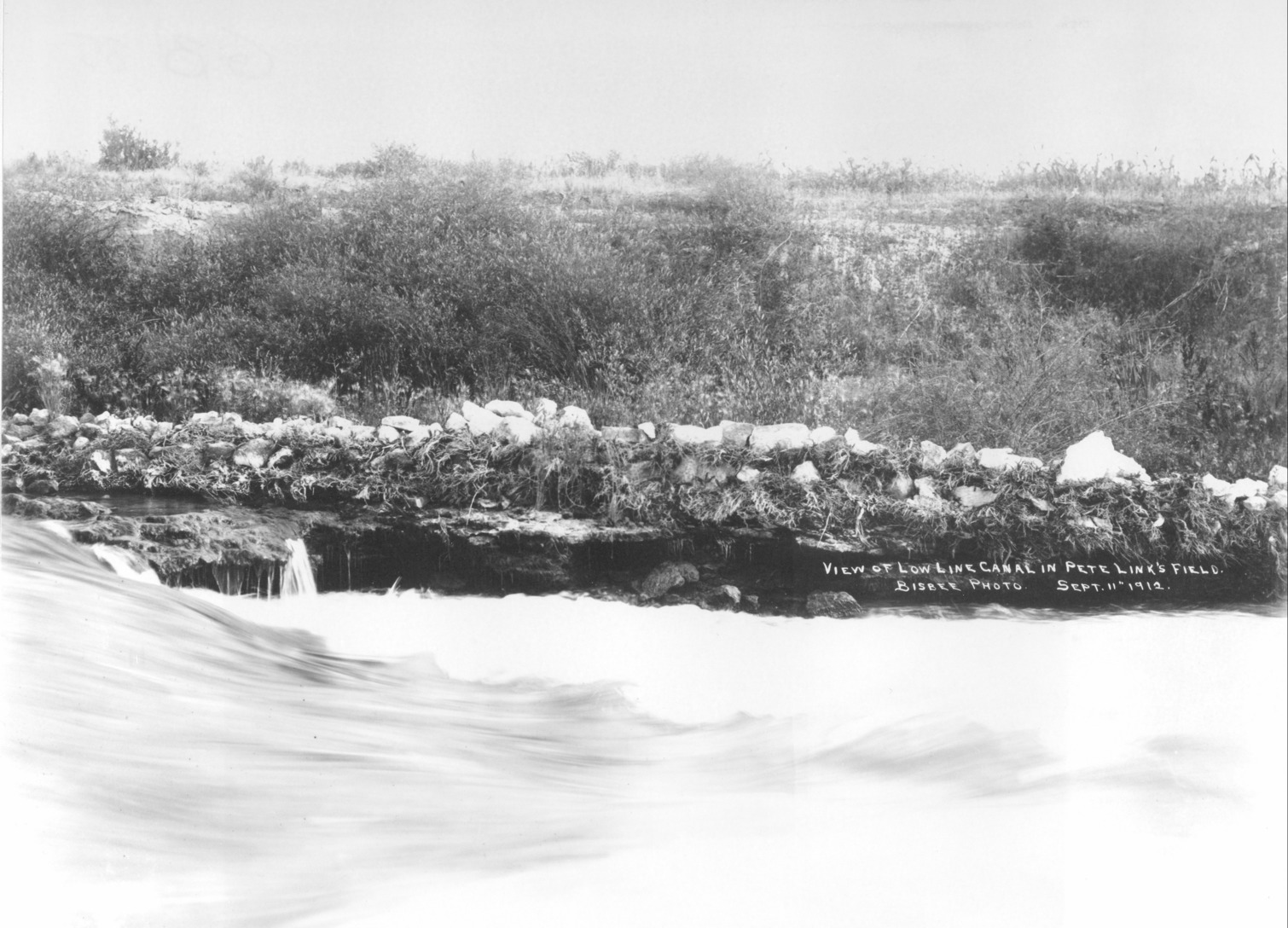 - "View of Low Line Canal in Pete Link's field; September 11, 1912;" water rushed along canal, eedged by rocks and sage brush.
