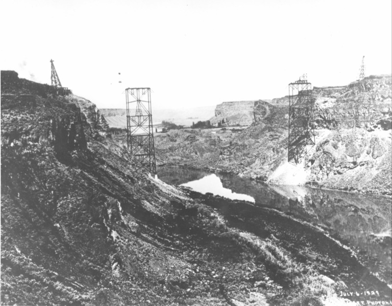 - "July 6, 1927;" Construction on the original Twin Falls Jerome Intercounty Bridge (later known as the Perrine Bridge); two cranes visible on either side of the canyon, with steel uprights of the bridge already affixed to the canyon walls. Looking west toward Blue Lakes and Perrine's farm and orchard.