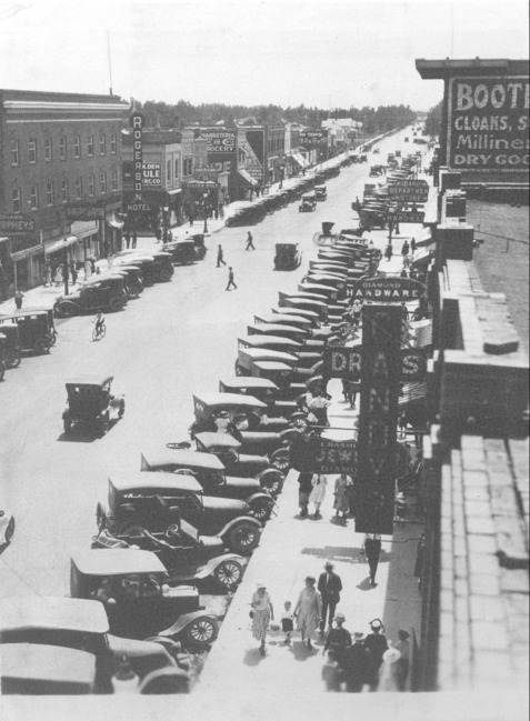 A view of busy Main Ave, looking southeast and taken from the top of the Twin Falls Bank and Trust building. Automobiles line the street and several people are on the sidewalks. Business and buildings visible include: Rogerson Hotel; the Golden Rule; American Electric Co.; Marketeria Cash and Carry Grocery; Idaho Department Store, Twin Falls Hardware, Booth Mercantile; Diamond Hardware; L. Rasmussen Jewelry; Candy