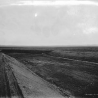 - Wide view of a dry canal bed. A man stands inside the bed in center background; gates are to left.