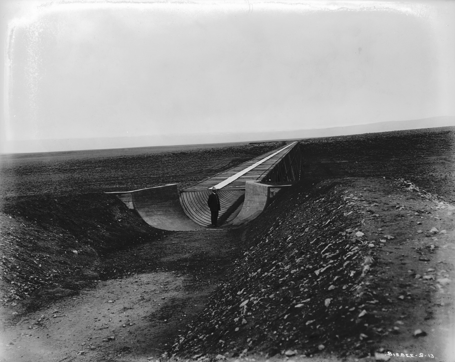 - A man stands in a canal flume, surrounded by a rocky berm.