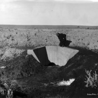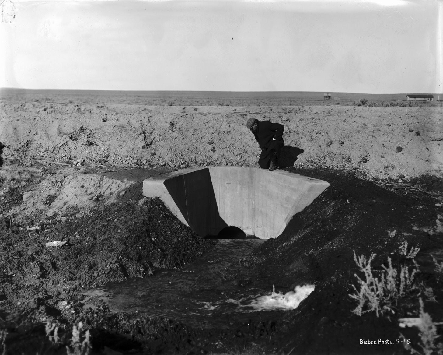 - A man looks into a concrete intake gate in an irrigation system. A house and outbuildings are in the background.