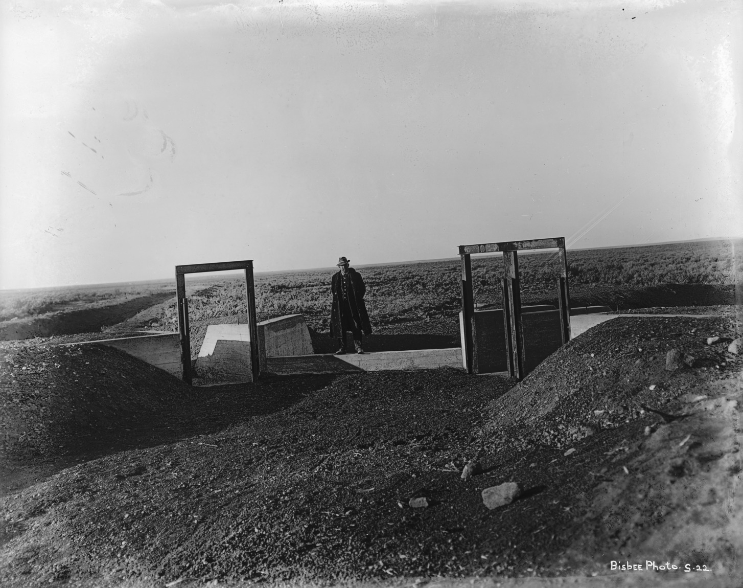 - A man stands atop canal gates under construction.