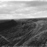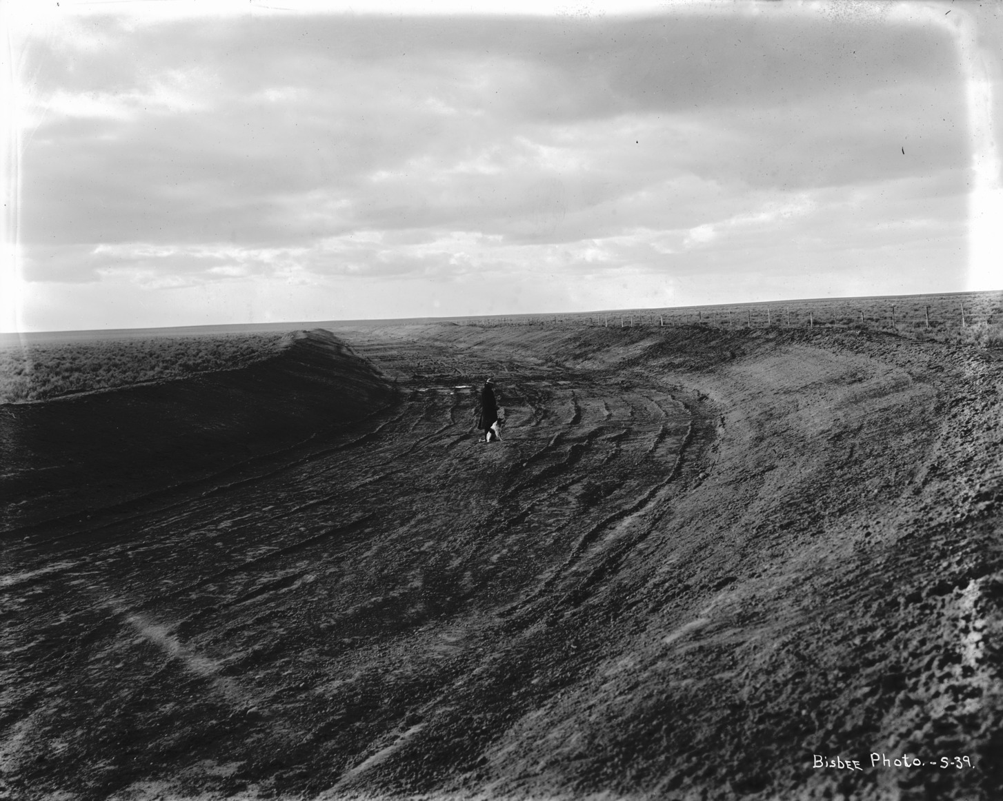 - A man and a dog stand at the bottom of a recently dug wide canal bed or channel.