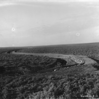 - Wide view of a dry canal traversing the sage brush; a two-horse buggy stands in the dry canal bed in the center.