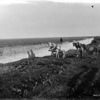 - Wide view of teams of horses and crews constructing a section of a canal. One man stands atop a concrete wall.