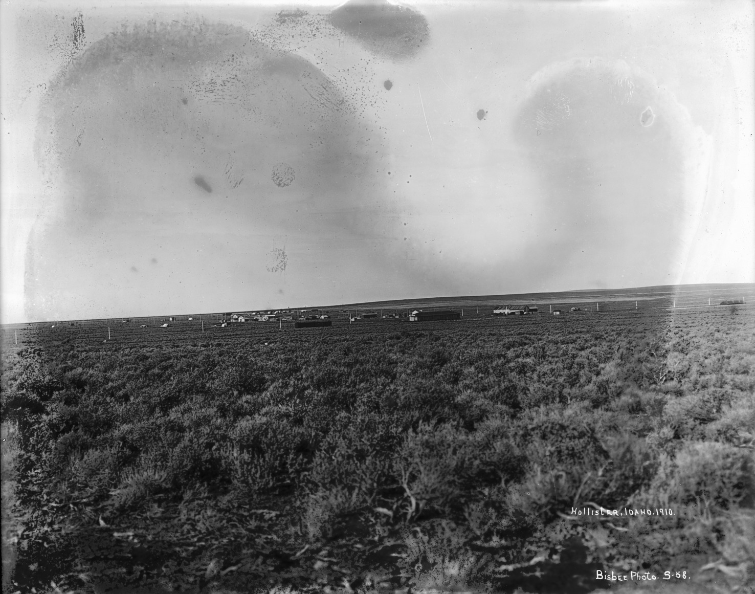 - "Hollister, Idaho. 1910;" wide view across sage brush of early Hollister townsite.