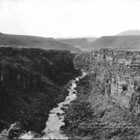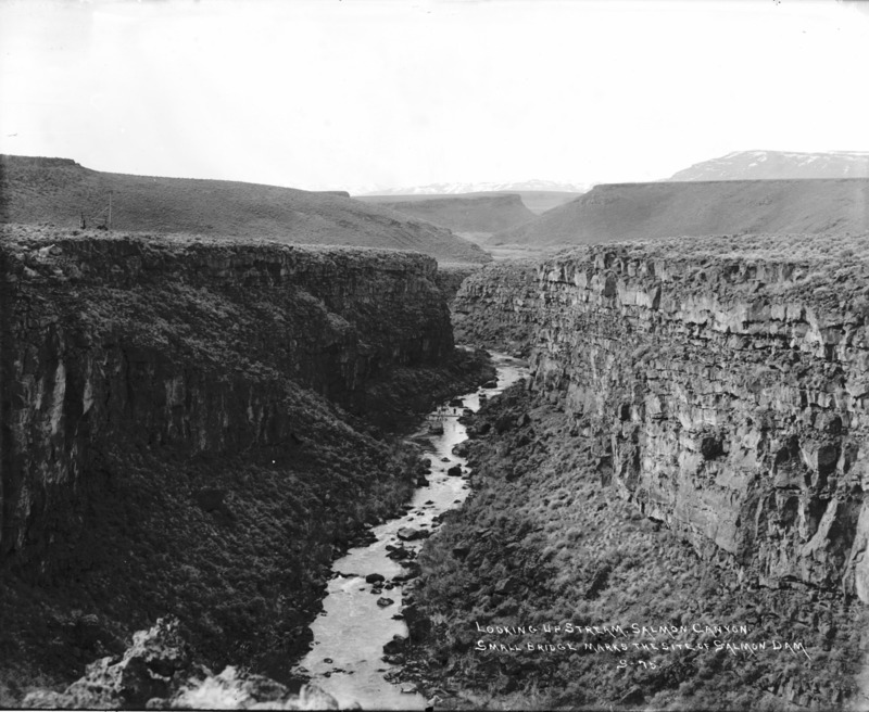 - "Looking upstream, Salmon Canyon; Small bridge marks the site of the Salmon Dam;" view down the Salmon Falls Creek Canyon; a man stands on the bridge over the river.