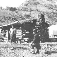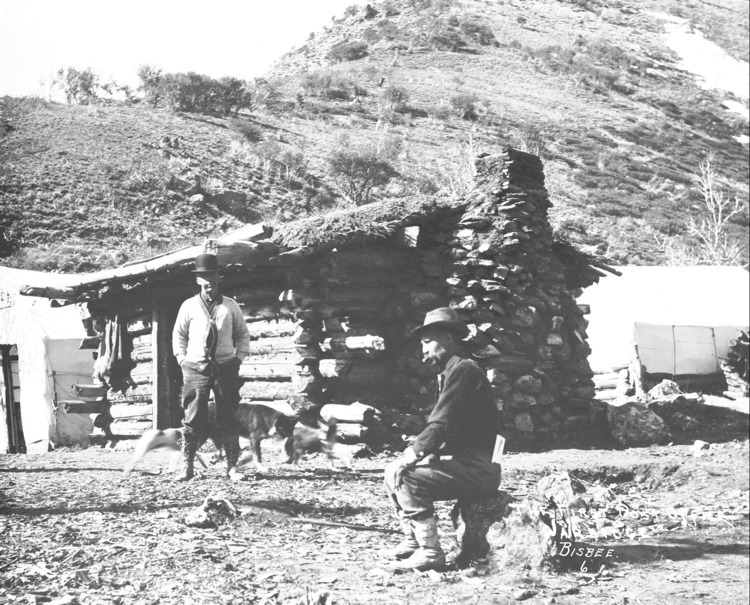 - "The First Post Office in Jarbidge; two men in front of a log cabin; large canvas tents behind the building