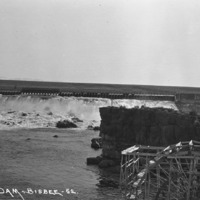 - "Milner Dam;" head gates; wooden water wheel in foreground.