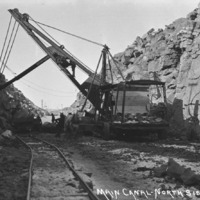 - "Main Canal - North Side;" men and machinery digging out the canal, tram rail visible on left.