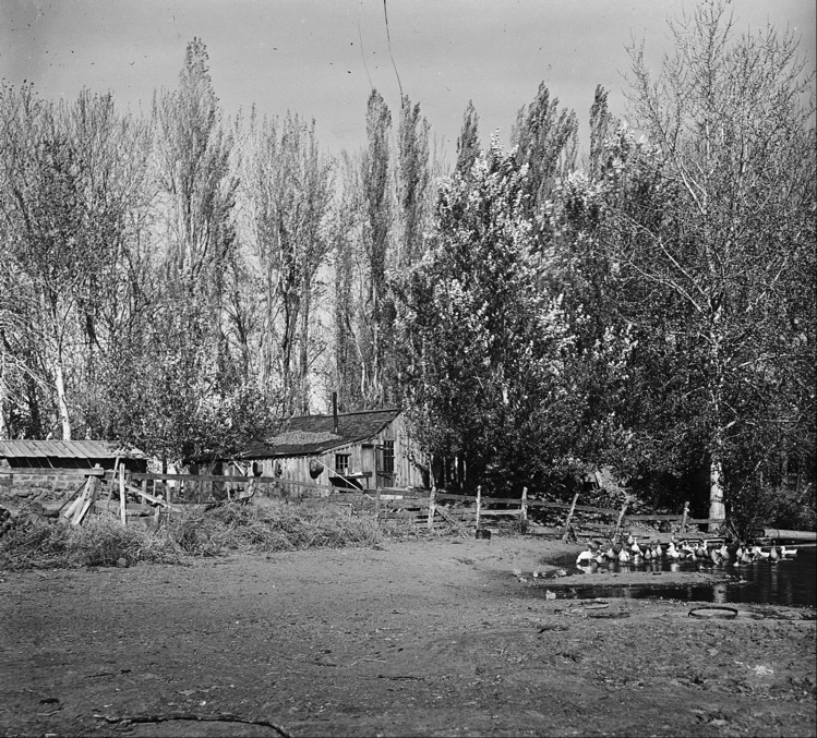 - Ducks float on a pond near a wooded cabin set amongst trees.