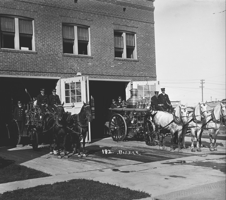 - The Twin Falls Fire Department. Seven men pose with two horse-drawn fire cartsin front of the fire station.