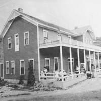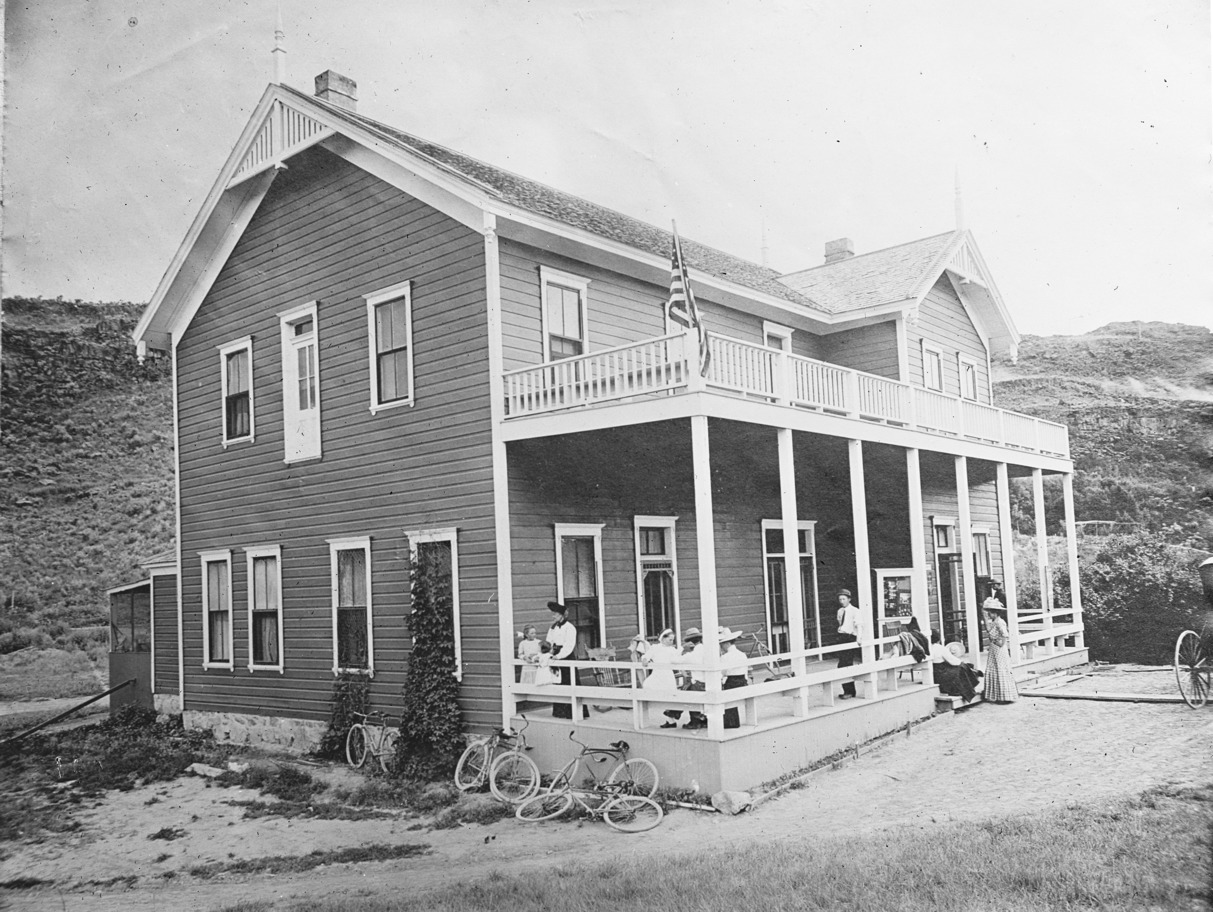 - "Shoshone Falls Hotel;" people gathered on the front parch; bicycles resting against side of the building