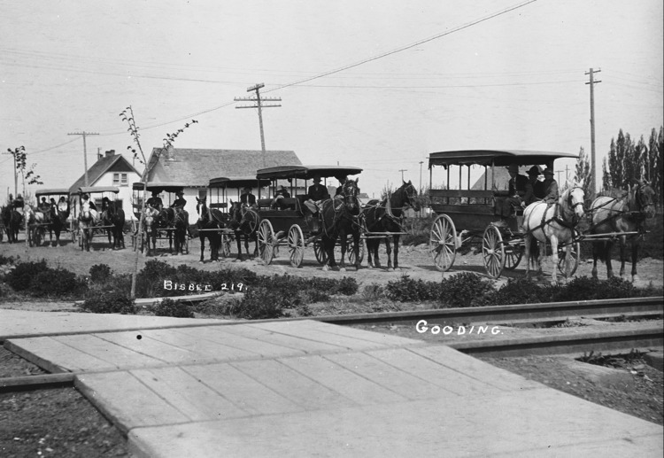 - "Gooding;" wagons, horses, and their drivers line a street. Several houses in the background, with a wooden boardwalk (sidewalk) and railroad tracks in the foreground.