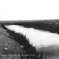 - "Salmon River Irrigation;" an automobile (car) traverses a bridge over a full canal; several buildings in background