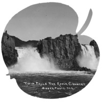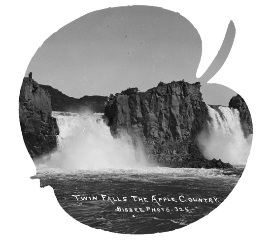 - "Twin Falls, The Apple Country;" the Twin Falls waterfall inside an apple-shaped cutout.