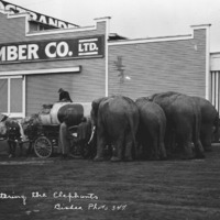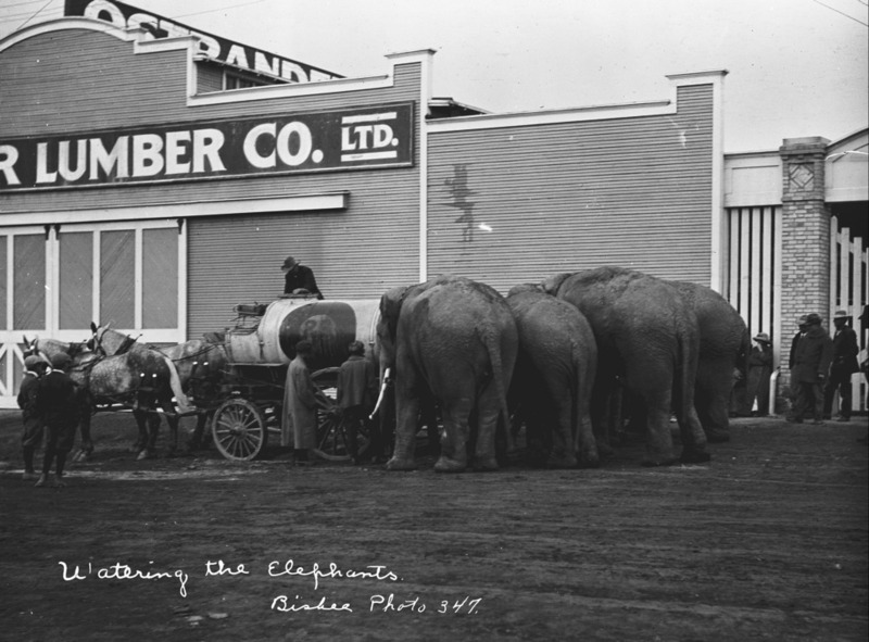 "Watering the Elephants;" four elephants being watered with a horse-drawn tank in front of the Ostrander Lumber Company; several men look on.