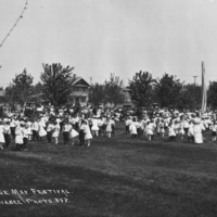 "The May Festival;" children gather near a maypole, with a crowd of people watching in City Park.