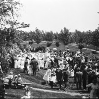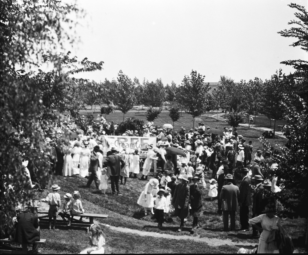 - A crowd of people in City Park gathered around a with a sign that reads, " Free Ice Cream Cones;"