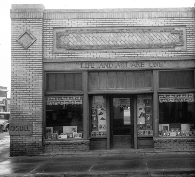 - The Bisbee Studio, with his motto, "Life and Art Are One" above the entrance. Portraits decorate the display windows.
