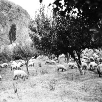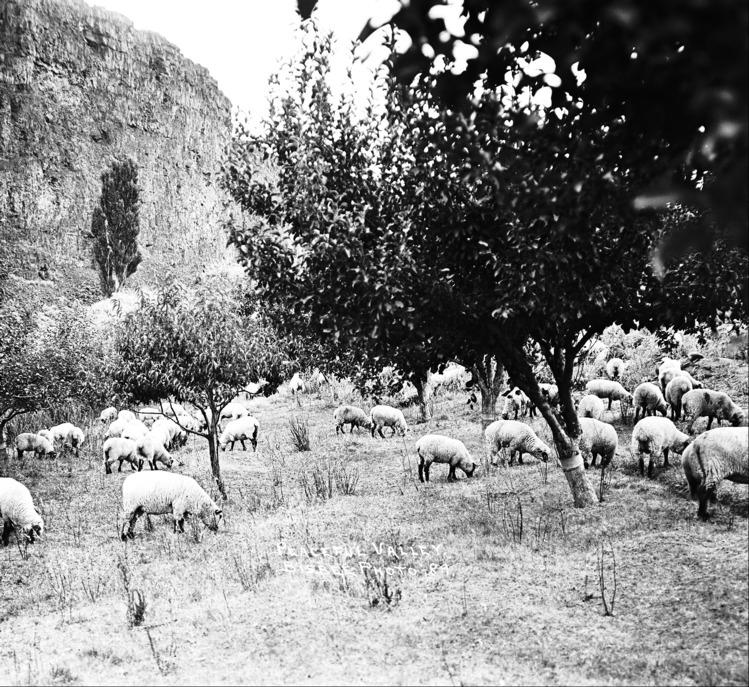 "Peaceful Valley;" sheep grazing under fruit trees on the Perrine Blue Lakes Ranch in the Snake River Canyon.