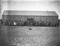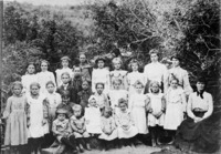 1940 A large group of school children posed at the side of the first school in Twin Falls.