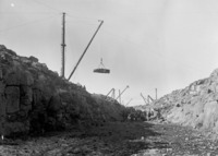 1938 A crew of men stand at the bottom of a canal channel. Several construction derricks can be seen along the rims.