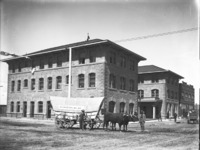 1928 A crowd gathered at the Hotel Perrine and along Main Ave, listening to speeches during Railroad Day. Flags and banners fly from the balcony of the Hotel, which is still under construction. (Description from Twin Falls News, 18 August 1905.)