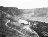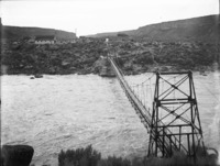 1930 A suspension bridge over the river near Auger Falls, near where Rock Creek joins the Snake River; buildings on the opposite bank.