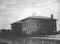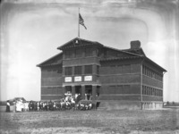1884 A crowd of people, mostly students in front of and entering Bickel School, soon after construction.