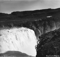 PC-2169 "Bridal Veil;" one of the three falls that make up greater Shoshone Falls. A woman stands on the dam above the Falls and two people stand o the cliff at the left.