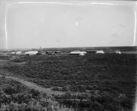 B 108 "Ditch Camp. North Side;" wide view of construction camp, with several tents and outbuildings among the sage brush. Several teams of horses at work on the left.