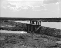B 102 "Head Gates at Wilson's Lake;" view along berm beside gates of North Side; a man stand at the gates; a building in background at right