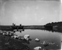 B 099 "Headgates at Wilson Lake, North Side;" a man stands at the gates