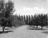 B 012 "Two Year Orchard; 1 1/2 miles north of Jerome, Idaho;" looking down rows of an irrigated field at a farmstead with house and several outbuildings