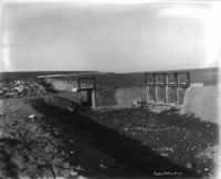 S 046 Wide view of canal system across sage brush plain, with gates in the foreground.