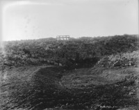 S 047 A dry canal bed at the base of a sage brush covered rock embankment. Gates at top of embankment. A man driving a two-horse buggy is stopped, ascending on the left side of the embankment.