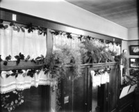 1699 Interior of Bisbee Studio. Ferns in vases and fireplace are visible.